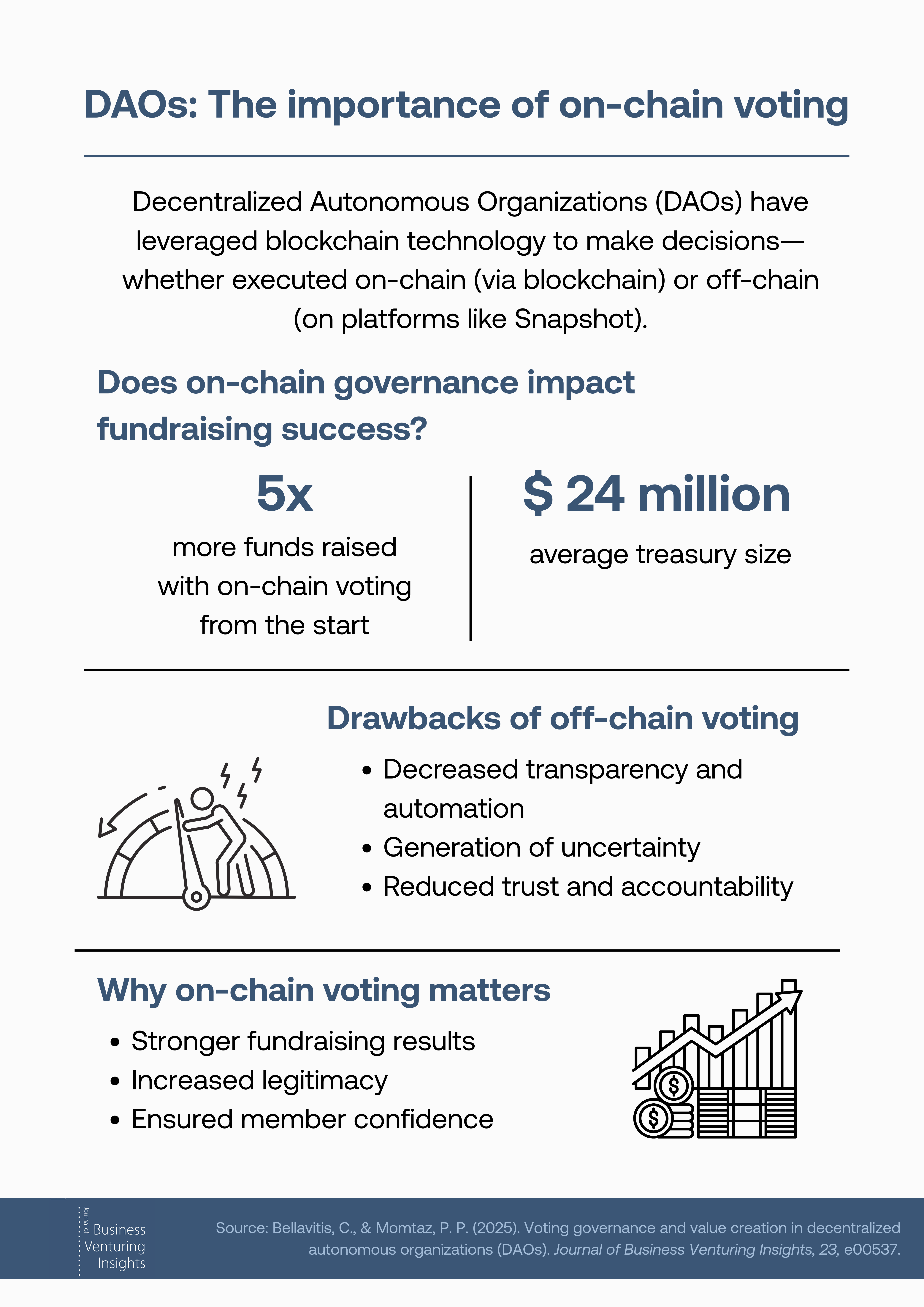 Decentralized Autonomous Organizations (DAOs) are rapidly emerging as a revolutionary organizational form in the blockchain world. They promise decentralized, transparent, and efficient governance without traditional hierarchical structures. But how DAOs make decisions—especially whether they vote on-chain (via blockchain) or off-chain (on platforms like Snapshot)—may dramatically impact their performance. Our study, published in the Journal of Business Venturing Insights, investigates how these governance choices affect DAO success, especially during early fundraising.