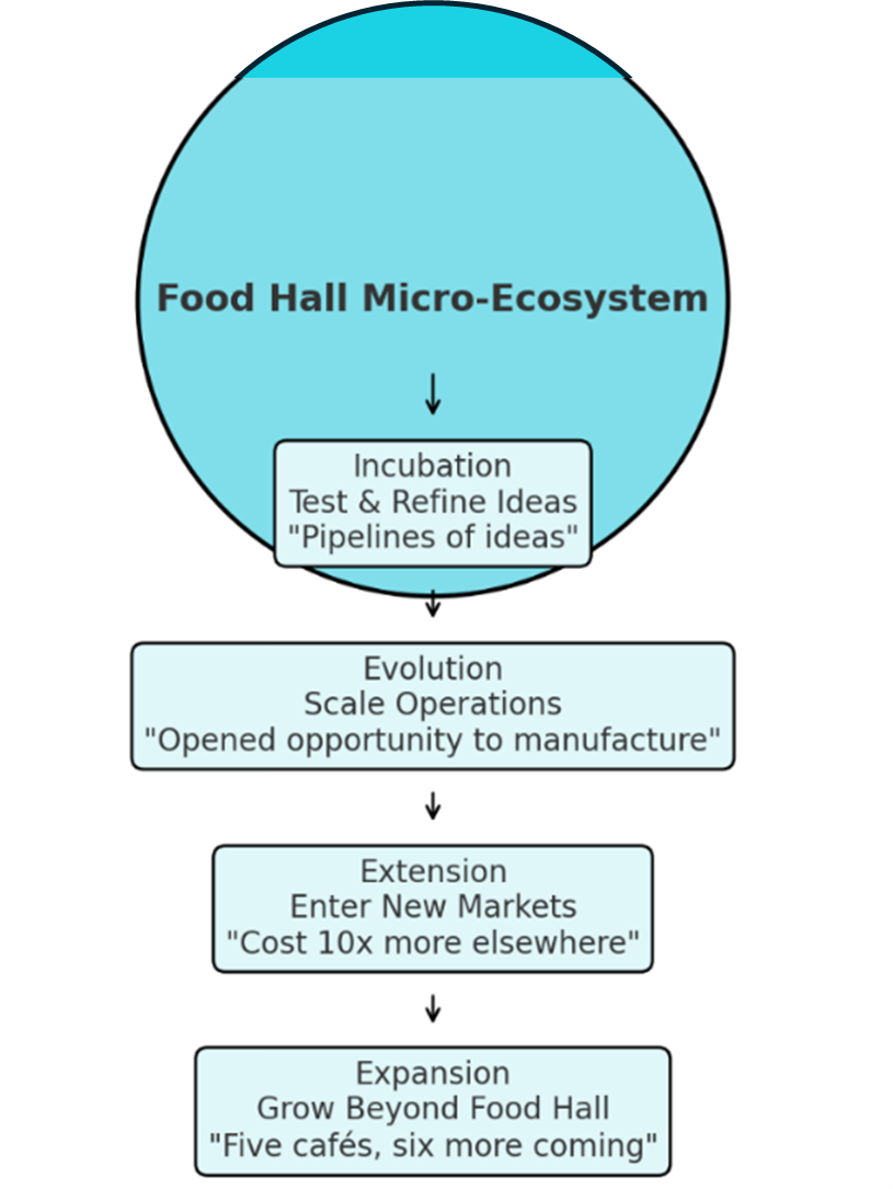 This work points to two interesting themes. One is focused on business development through four distinct progression pathways associated with food halls and the second theme describes the development of the hyperlocal area and micro-ecosystem surrounding the food hall.